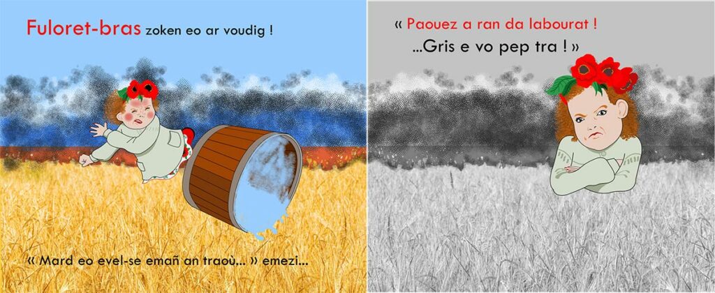 Marousya est la fée qui peint son pays. Elle soigne son travail, mais voilà qu’on vient le salir ! Alors elle range ses outils. quantité de Marousya n’eo ket laouen !